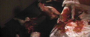 BLOOD is splattered over the floor, bed, walls. The camera drifts.