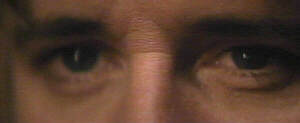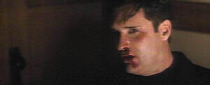 Fred is hovering over her on the tape, ON HIS KNEES, A HORRIFIED, UNBELIEVING EXPRESSION ON HIS FACE. On the tape, Fred turns away from Renee - his hands raised, dripping blood - her blood. His movements are almost mechanical, constricted, as he strains strangely upwards seemingly against his will, as if feeling