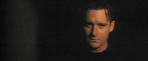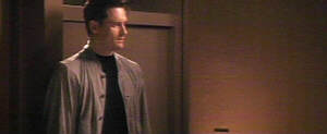 Fred's expression is strained. He is alone. Fred pulls a videotape out of the envelope and inserts it in the VCR, turns it on. He sits on the couch and watches.